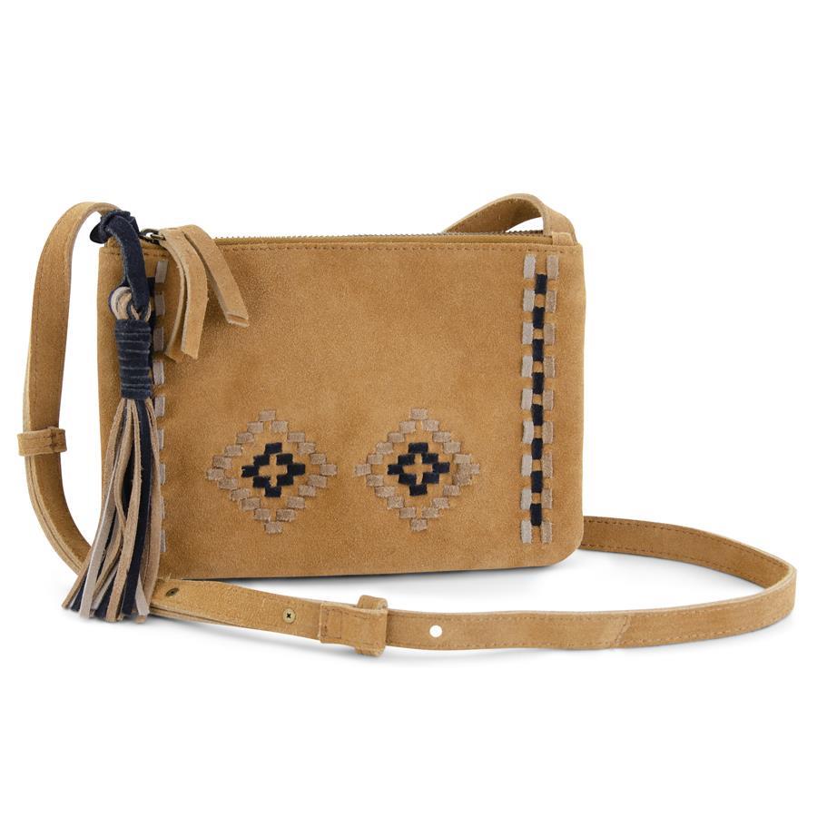 8.5 Inch Camel Suede Crossbody w/Aztec Trim and Tassel