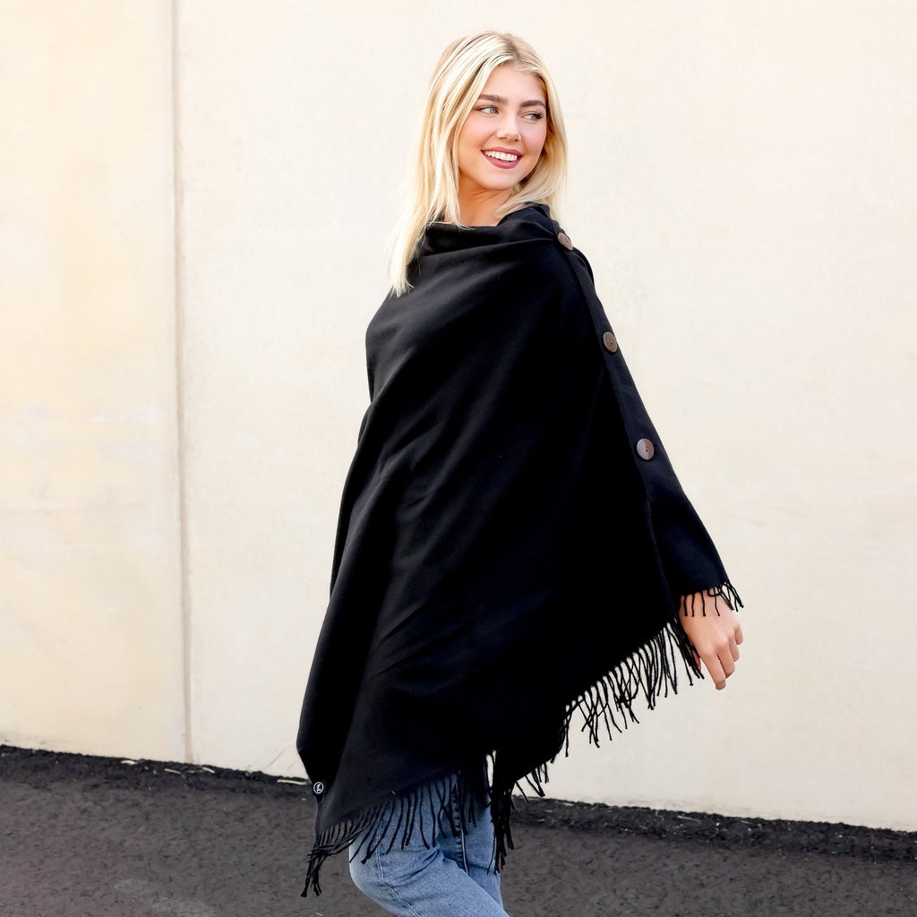Snuggle up with this cozy plaid button scarf, and add both function and style to your outfit! Plaid is a classic, timeless choice, yet on-trend for fall. These blanket scarves have real wooden, functional buttons that convert this traditional scarf into a shawl/cape that can be worn in a number of different ways. Buttons down the middle or to the side. Unbuttoned to wrap around your neck. Perfect for the cooler nights ahead, a football game, bonfire, when a jacket is just too much. And throughout the season for the simple, classic style you are looking for.