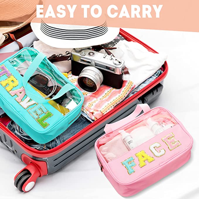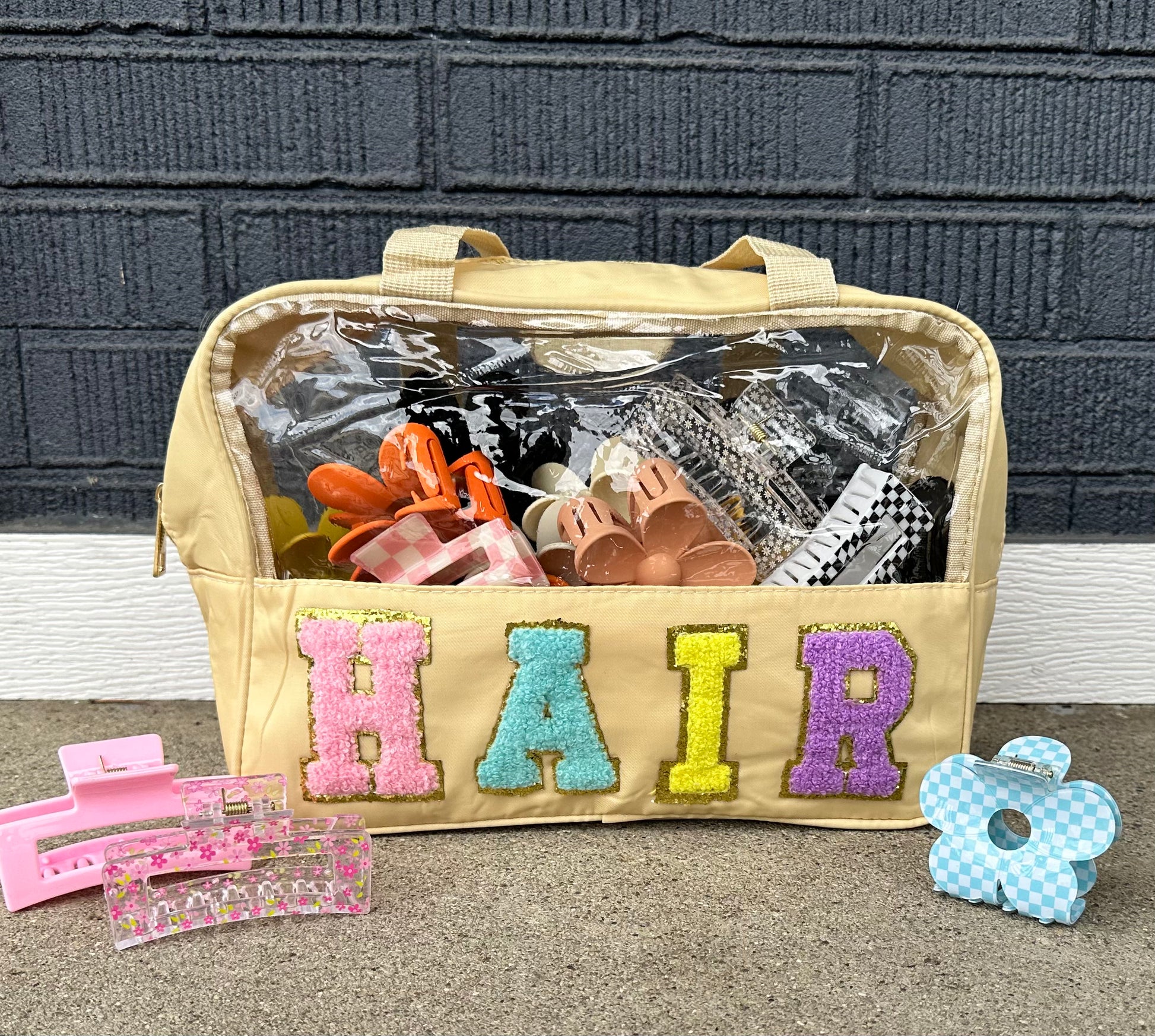 Chenille Letter Nylon HAIR Bag PVC Clear Zipper Pouches