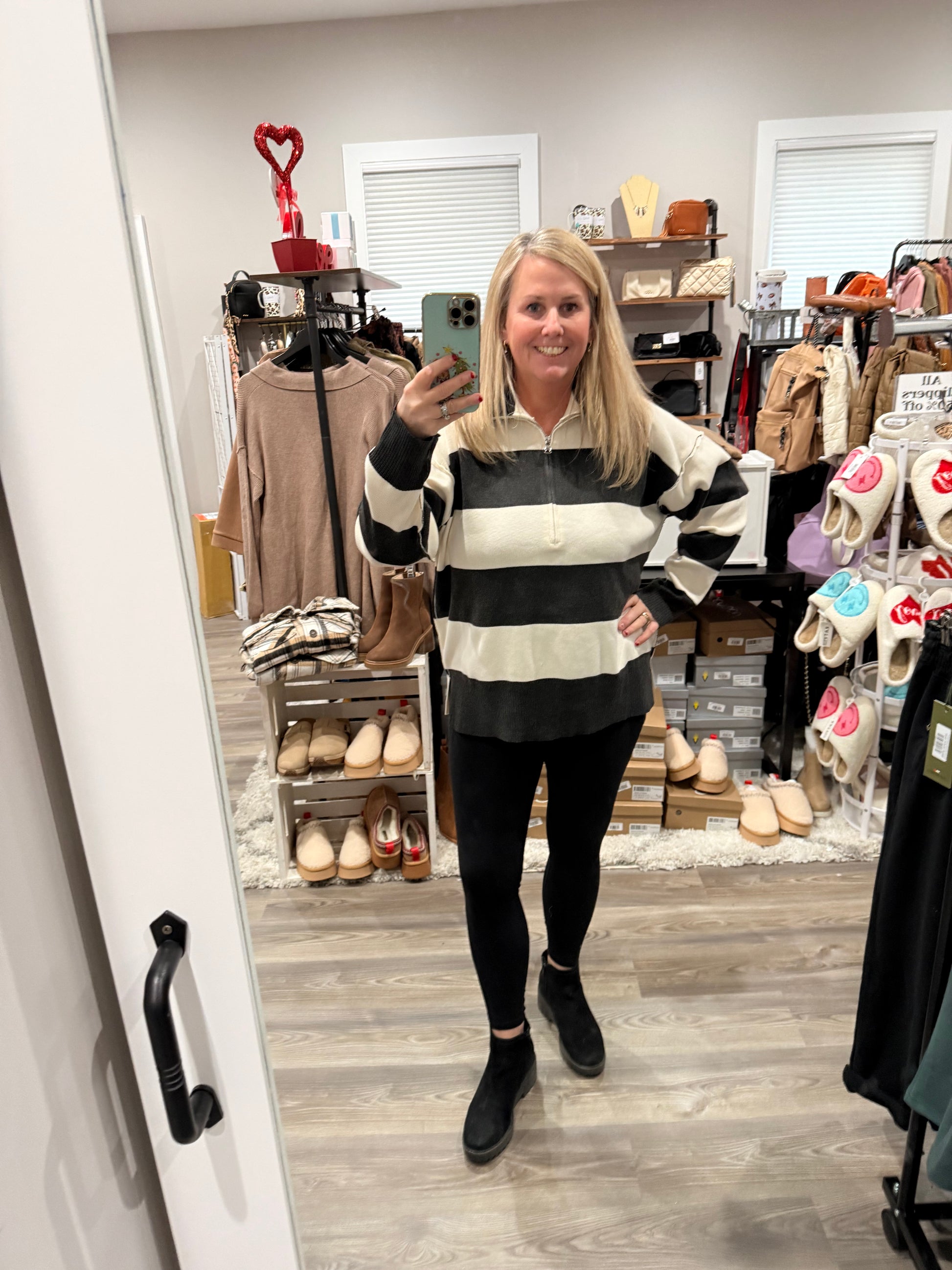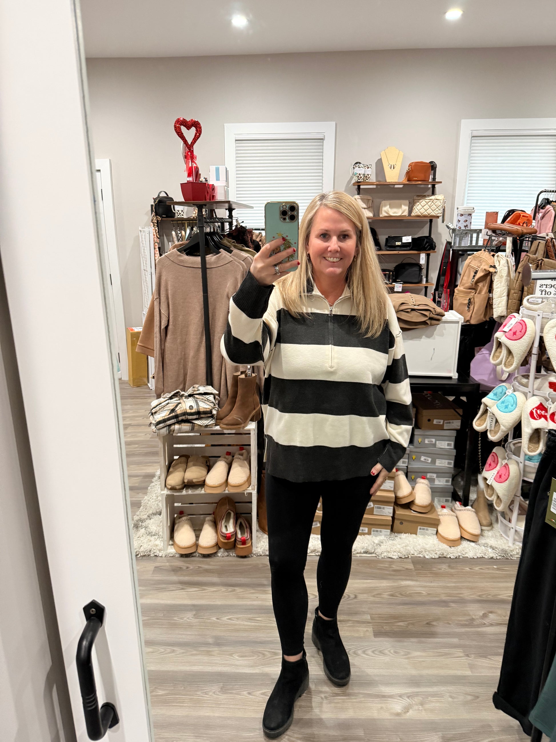 Get ready to cozy up in style! This drop shoulder striped sweater is your new go-to for effortless cool. Zip it up when you want extra warmth, or leave it open for that laid-back vibe. The playful stripes keep things fun, while the reversed stitch details add a quirky touch that shows you've got an eye for the details. Side slits? Yes, please—they're perfect for moving freely without sacrificing that snug, comfortable feel. Whether you're running errands or hanging with friends, this sweater makes looking put-together feel like zero effort.