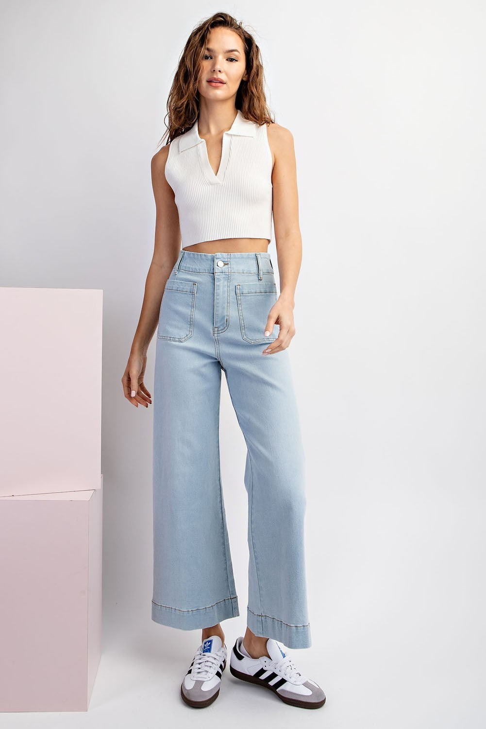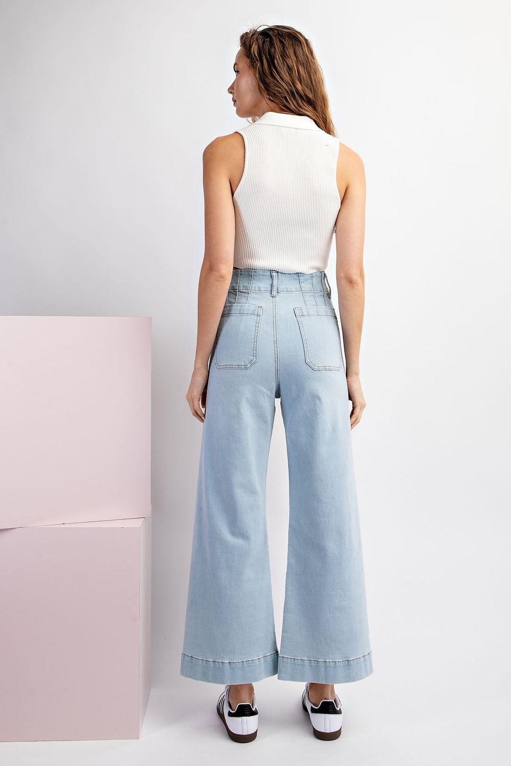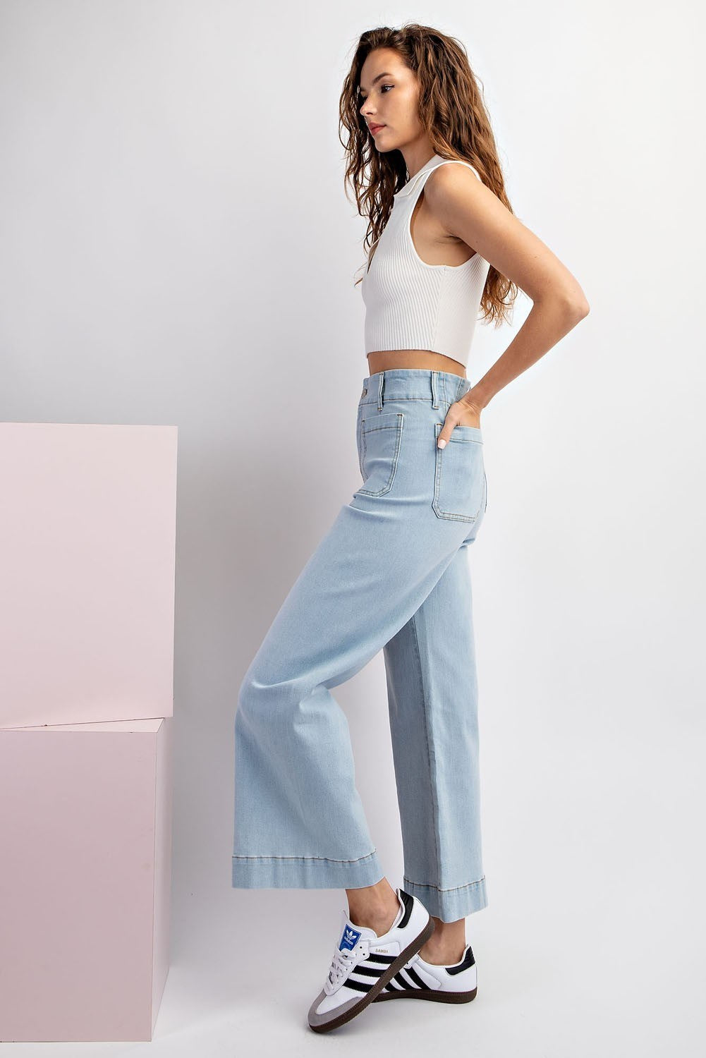 Mineral washed denim pants featuring a button and zipper closure, belt loops, two open front pockets, two back pockets, is a straight leg style and is a slight stretchy material.