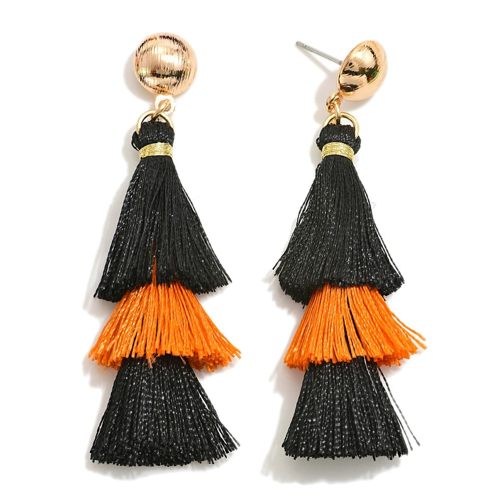 These Two Tone String GameDay Tassel Drop Earrings are approximately 2.5" long and feature a stylish and versatile design in orange and black. Perfect for adding a touch of flair to any outfit, these earrings are sure to make a statement.