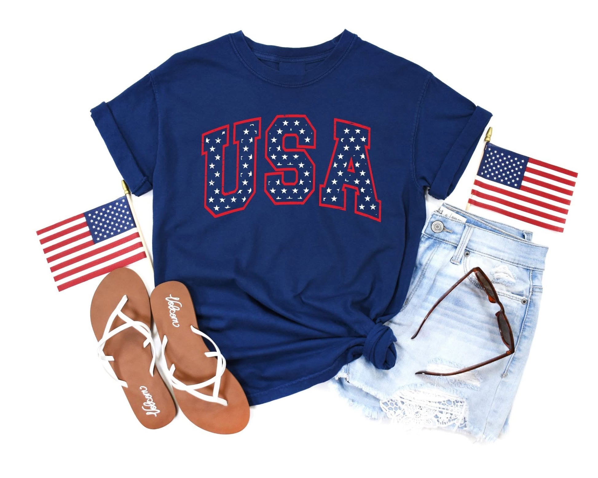 Celebrate Independence Day in style with our USA Tshirt in Navy! This cute and playful top is perfect for showing off your patriotic spirit on the 4th of July. Don't miss out on this must-have addition to your wardrobe.